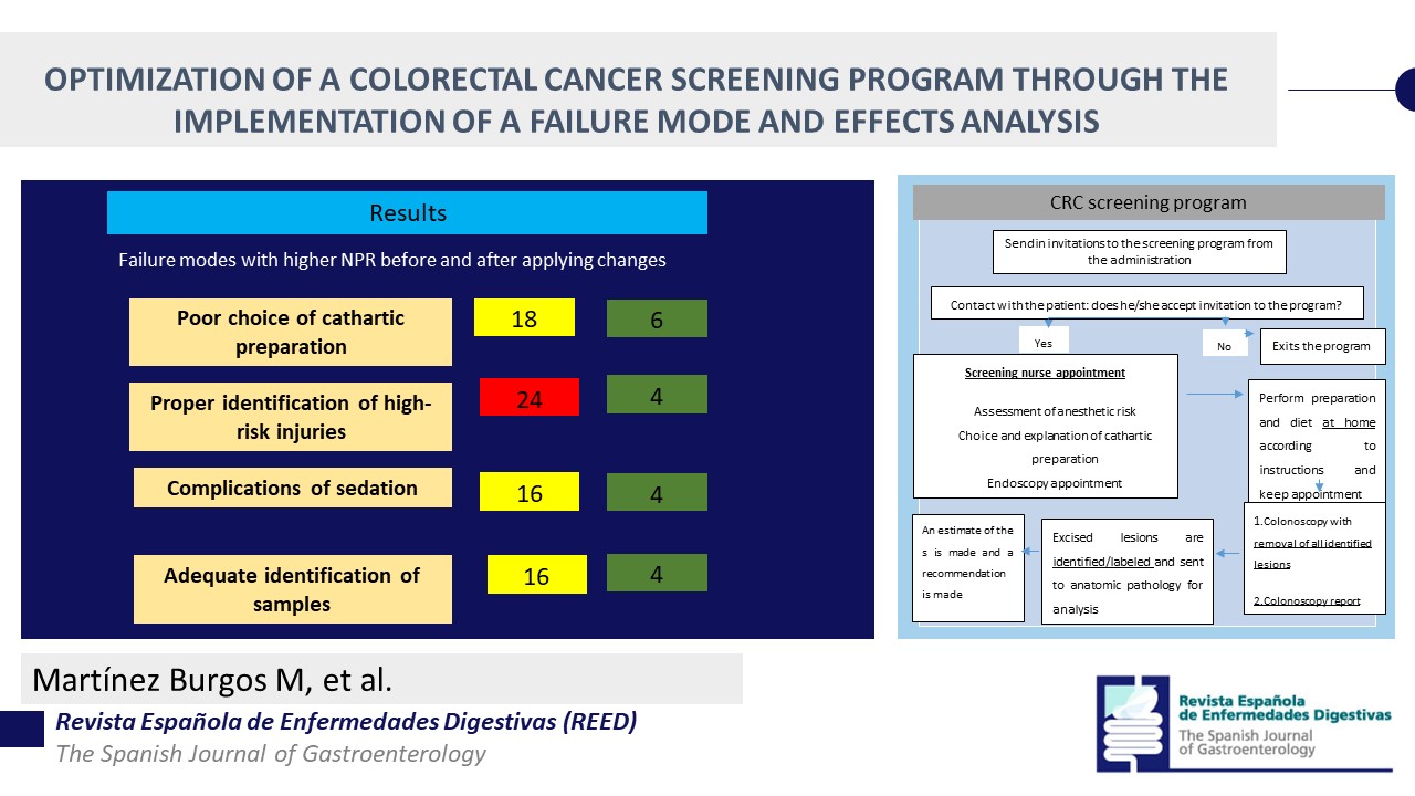 Martínez Burgos M, Villena-Salinas J, Morán Sánchez S, Martínez Otón J. Optimization of a colorectal cancer screening program through the implementation of a failure modes and effects analysis (FMEA). 10646/2024