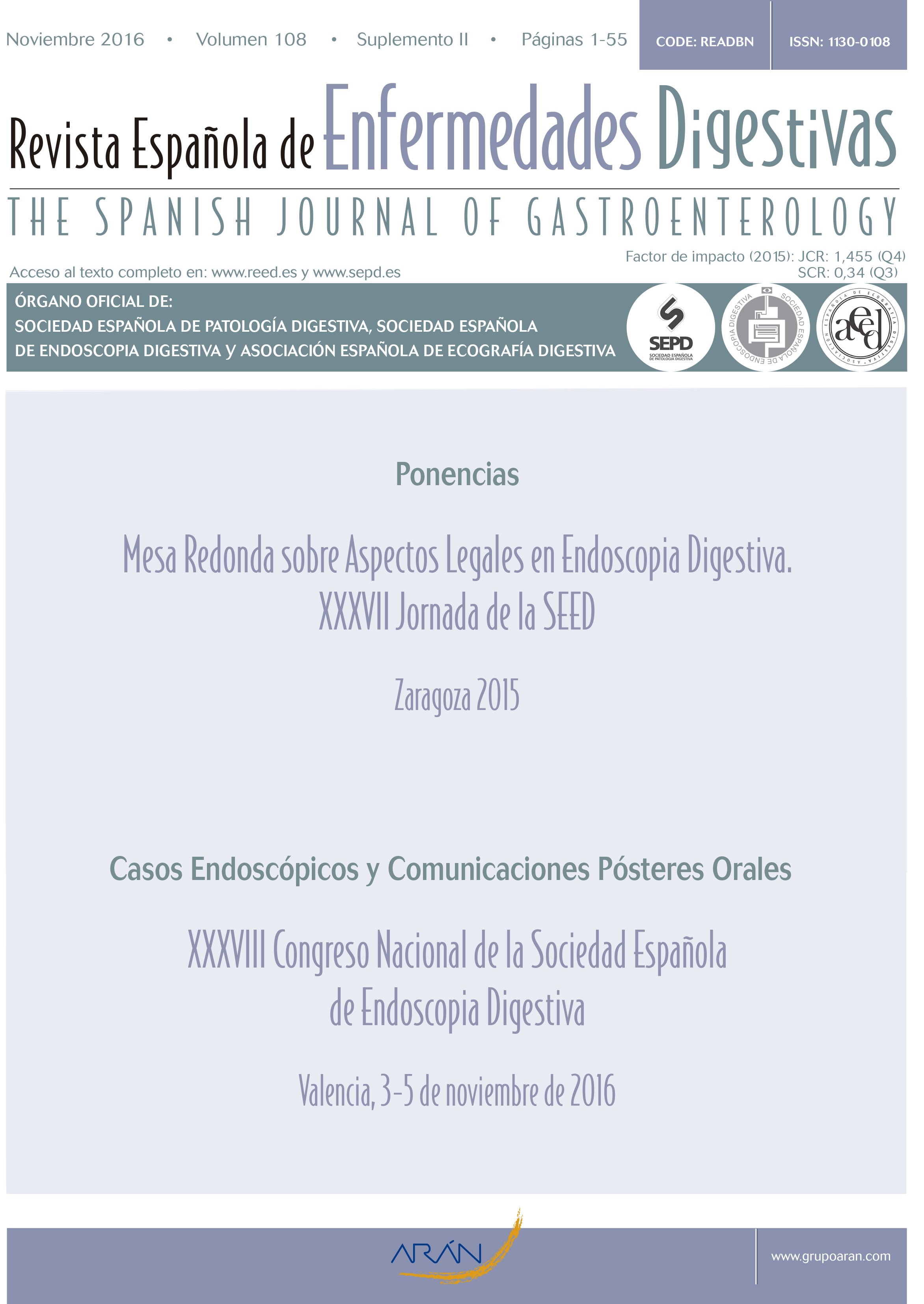 The Spanish Journal of Gastroenterology is the official organ of the Sociedad Española de Patología Digestiva, the Sociedad Española de Endoscopia Digestiva and the Asociación Española de Ecografía Digestiva